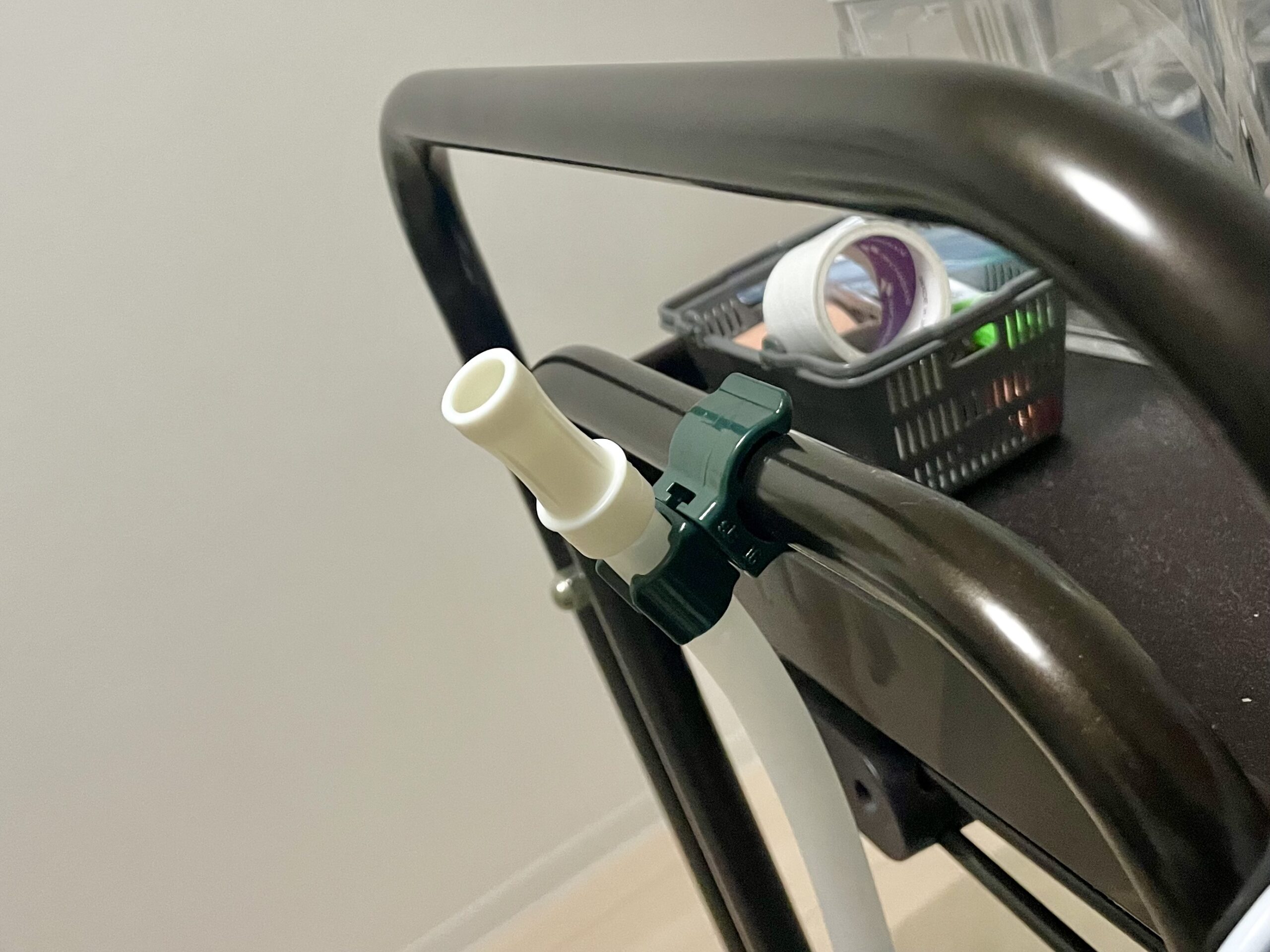 新しい吸引器がやってきて、ホースの置き場所、置き方に悩んでいた。