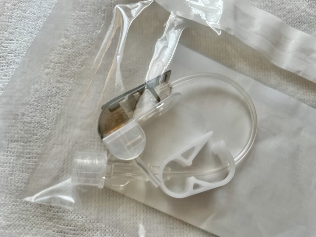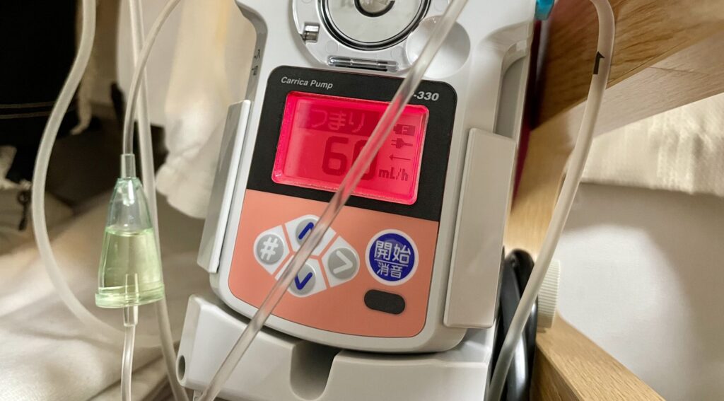 ベッドに戻ったら、ポートに針を刺して点滴を再開する。